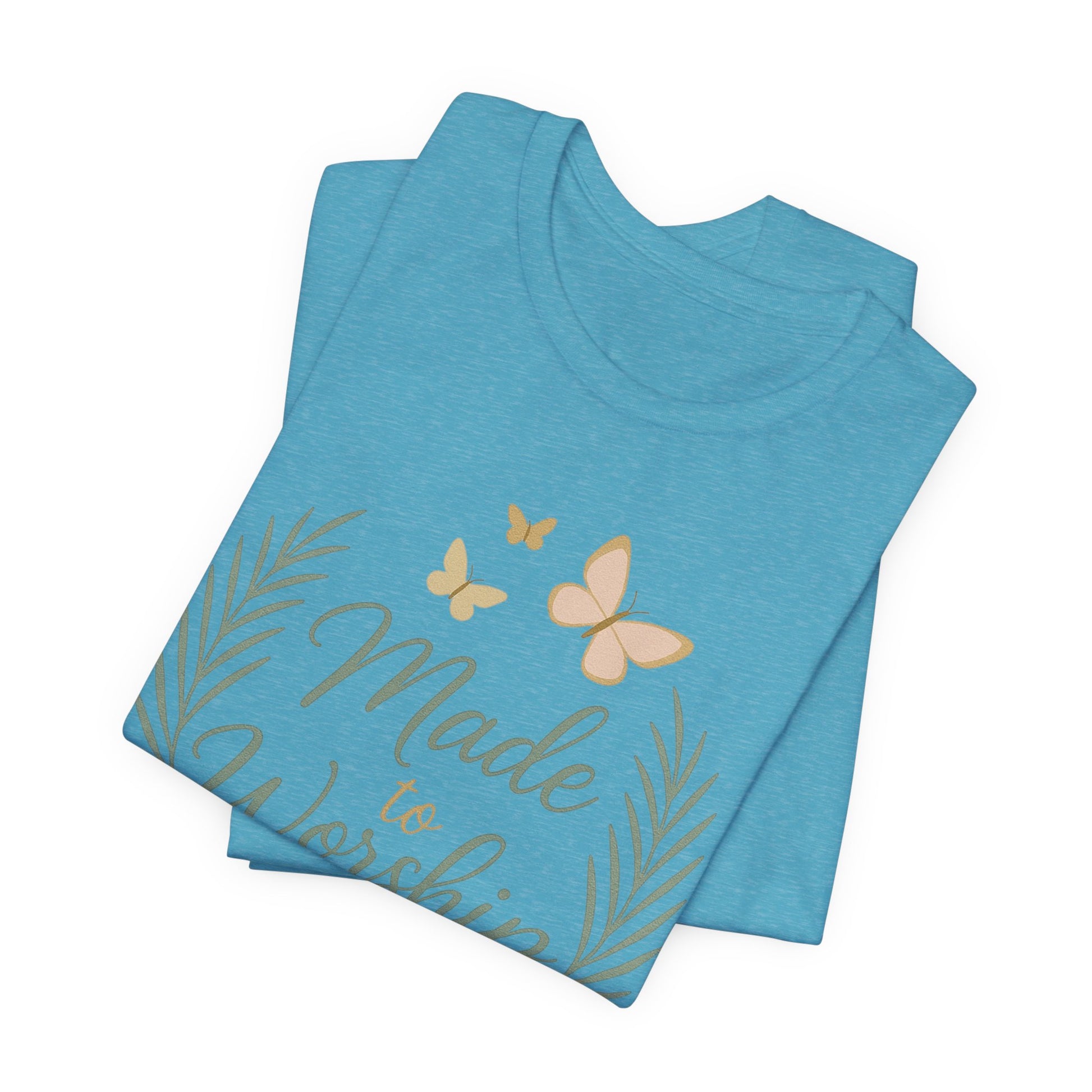 Lightweight, breathable, and quietly expressive — this jersey tee carries a gentle message: “Made to Worship.” Soft sage palms curve around delicate script while muted butterflies lift above, giving the design a calm, worshipful energy. It feels like a Sunday morning in soft sunlight: easy to wear, simple to layer, and gentle on the skin thanks to Airlume combed and ring-spun cotton. The retail crew neckline and side seams keep the silhouette tidy, while a tear-away label keeps distractions to a minimum. Wear it to morning service, a small-group meet-up, or on days when you want your faith expressed with understated grace.